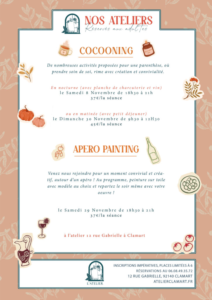 L’automne est à nos portes, on vous a donc concocté pleins d’activités créatives pour lutter contre la pluie ! On remet le couvert avec nos ateliers cocooning, les apéros painting et notre traditionnel stage du calendrier de l’avent, pensez donc à bien regarder le programme sur nos deux ateliers !