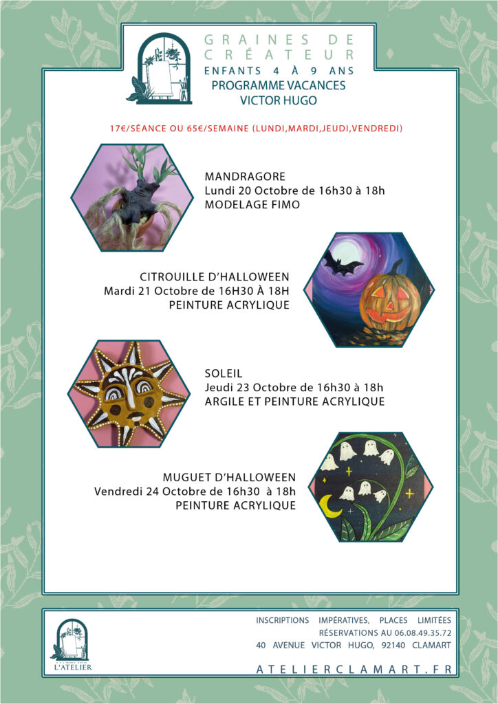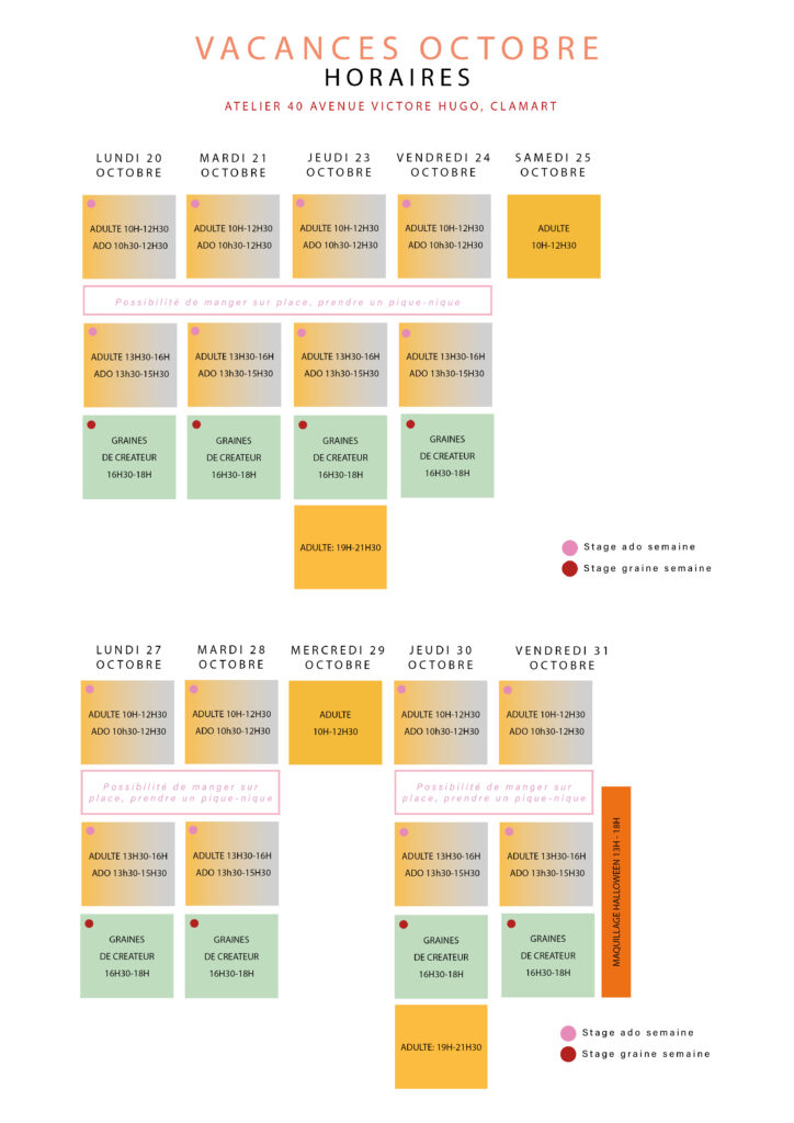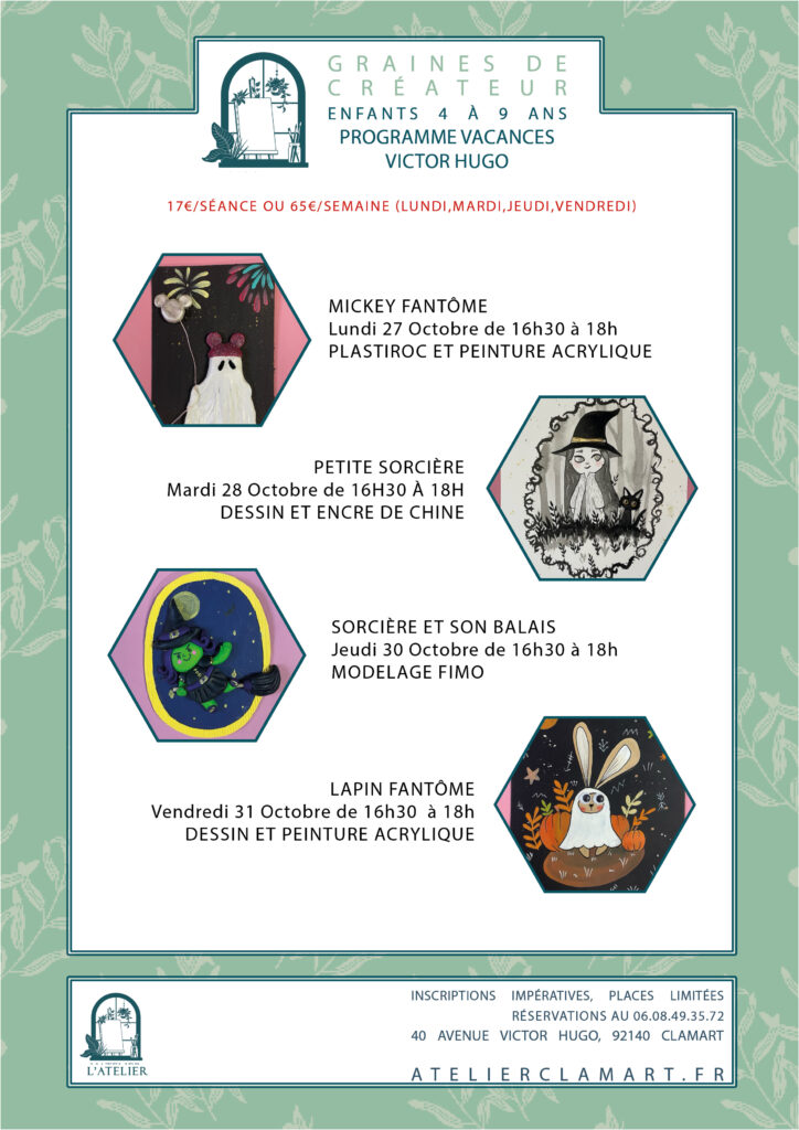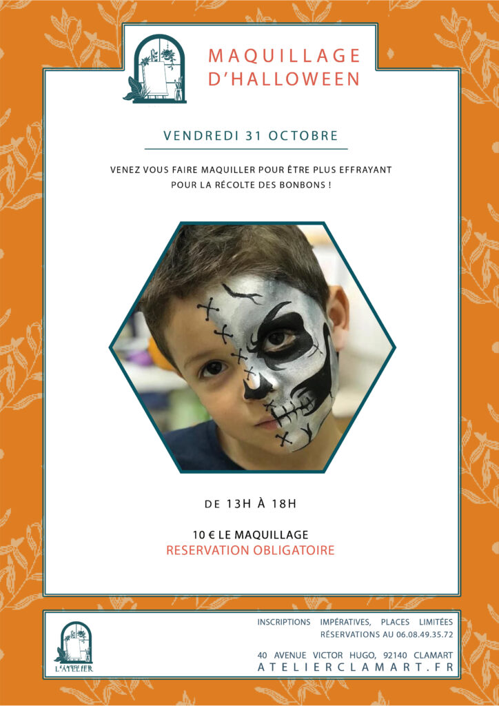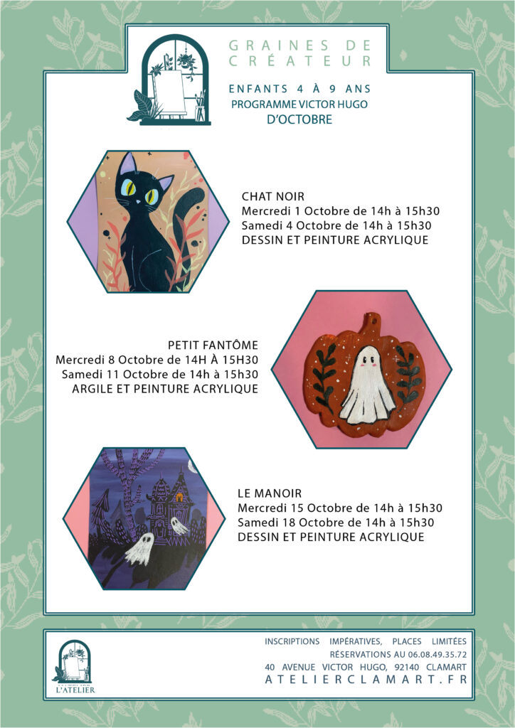 On espère que votre rentrée s’est bien passée, on est ravies de vous revoir nombreux à l’atelier ! On vous a préparé un programme bien rempli pour les vacances qui arrivent, venez fêter Halloween avec nous !